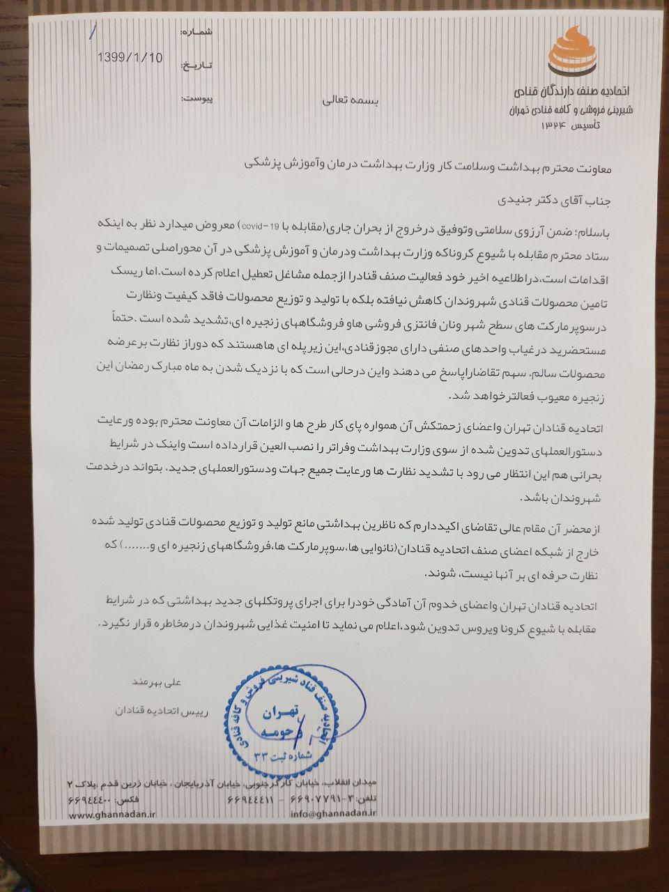 به اطلاع كليه اعضاء محترم صنف قنادان تهران مي رساند متاسفانه علیرغم هشدارها واطلاعیه های پی درپی اتحادیه قنادان تهران مبنی برتعطیلی کلیه واحدهای قنادی براساس مصوبه ستادمقابله باکرونا وعدم رعایت برخی همکاران، سه واحد قنادی توسط اداره اماکن نیروی انتظامی پلمب شد.