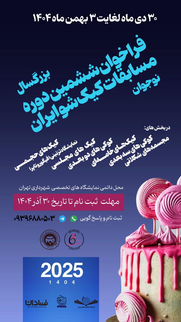 ششمین دوره مسابقات کیک شو ( بزرگسال و نوجوان) تاریخ برگزاری : سی دی ماه لغایت سوم بهمن ماه محل برگزاری : بوستان گفتگو